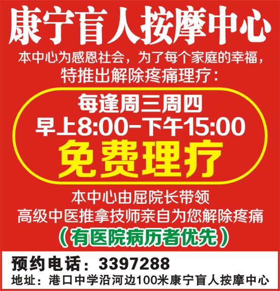 地址:港口中学沿河边100米康宁盲人按摩中心