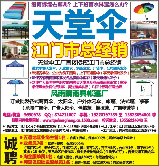 ●门店地址:江门义乌小商品批发城东门1107-1111铺(天堂伞总经销)