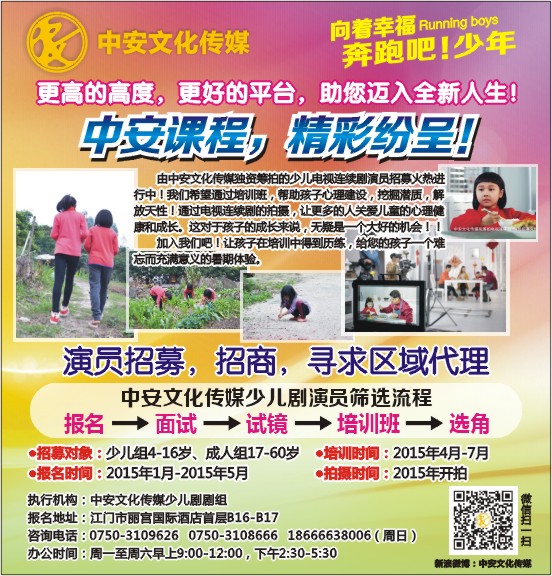 由中安文化传媒独资筹拍的少儿电视连续剧演员招募火热进行中!我们希望通过培训班,帮助孩子心理建设,挖掘潜质,解放天性!通过电视连续剧的拍摄,让更多的人关爱儿童的心理健康和成长。这对于孩子的成长来说,无疑是一个大好的机会!!