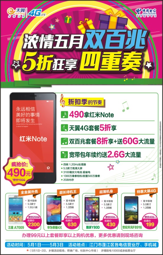活动时间:5月1日-5月3日 活动地点:江门市蓬江区各电信营业厅、手机城