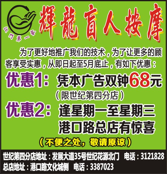 优惠1:凭本广告双钟68元(限世纪第四分店)