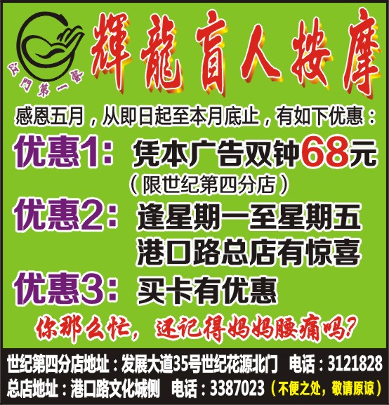 优惠1:凭本广告双钟68元(限世纪第四分店)