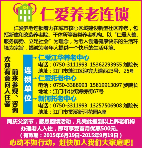 仁爱养老连锁着力在城市核心区域建设新型社区养老,包括新建和改造养老院、干休所等各类养老机构。以“仁爱人善、
