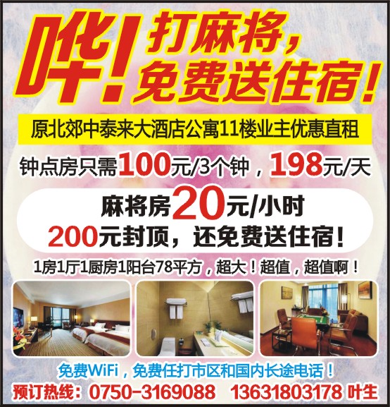 原北郊中泰来大酒店公寓11楼业主优惠直租 钟点房只需100元/3个钟,198元/天 麻将房20元/小时 200元封顶,还免费送住宿! 1房1厅1厨房1阳台78平方,超大!超值,超值啊! 免费WiFi,免费任打市区和国内长途电话! 预订热线:0750-3169088 13631803178 叶生
