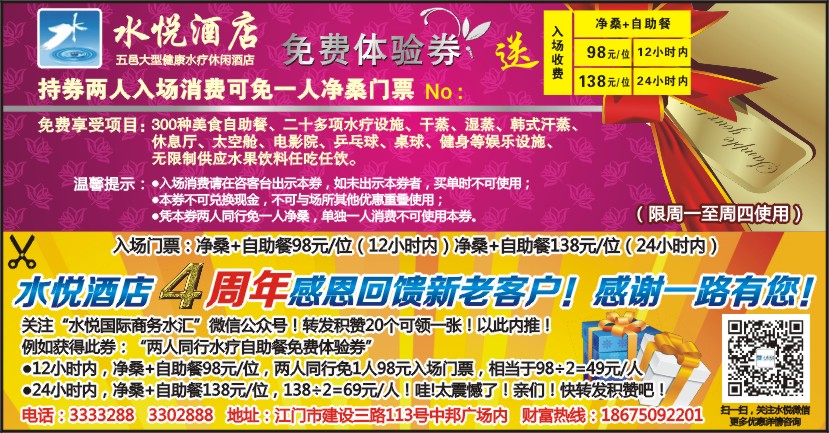 关注“水悦国际商务水汇”微信公众号!转发积赞20个可领一张!以此内推!