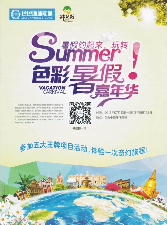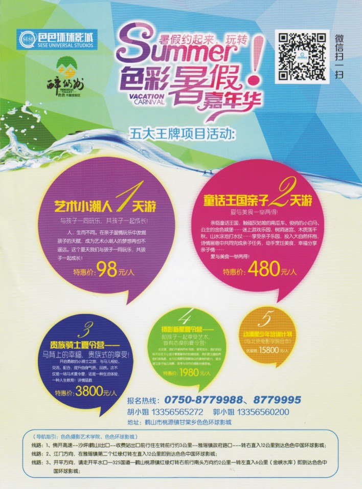 暑假约起来,玩转“色彩暑假”嘉年华! 每个孩子都是天使,他们带着上帝赐予他的独特天赋降临于世,用自己的天性特征看待世界。每个孩子都是天才,无论是看似幼稚的图画,还是天真的文字,他们都在用自己的独特方式观察世界。 大千世界犹如奇妙无比的魔法,让无数孩子心神向往。幼小的心灵强烈渴望经历一次奇幻旅程。为守护孩子的梦,发掘孩子的天性,色色中国环球影城隆重推出“色彩暑假”嘉年华,人生而不同,人贵在独特。暑假约起来! 时间:2015年07月12日—2015年08月23日 地点:色色中国环球影城 参加五大王牌项目活动,体验一次奇幻旅程! 五大王牌项目活动: 艺术小潮人1天游 与孩子一同玩乐,共孩子一起成长! 人,生而不同。在亲子温情玩乐中发掘孩子的天赋,成为艺术小潮人的梦想再也不遥远。这个夏天我们与孩子一同玩乐,共孩子一起成长!特惠价:98元/人! 童话王国亲子2天游 爱与美食一举两得! 亲临童话王国,触碰灰姑娘的南瓜车、俊俏的小白马、公主的金色城堡…… 迷上游戏乐园,树洞迷宫、木质荡千秋、山水泳池打水仗…… 享受亲子乐园,投入大自然怀抱,诗情画意中共同完成亲子任务,动手烹饪美食,幸福分享亲子情…… 爱与美食一举两得!特惠价:480元/人! 3贵族骑士夏令营 马背上的幸福,贵族式的享受! 开启勇敢的小骑士之旅,与马儿相处、交流、配合,提升自身气质、品质。这不仅是一场马术夏令营,还是一种生活体验,一种人生教育!特惠价:3800元/人! 4摄影新星夏令营 和孩子一起享受艺术,做有态度的夏令营! 在这里,我们不崇尚特长考级、获奖加分,我们的目标不仅在于让孩子掌握基本的拍摄技能,我们更注重培养他们多角度、全方位观察和理解身边的事物的能力,逐步建立孩子独立观察、思考与创作的摄影创意思维。特惠价:1980元/人! 55、动漫星少年培训计划 (与北京电影学院合作) 特惠价:15800元/人! 报名热线:0750-8779988、8779995 胡小姐 13356565272 郭小姐 13356560200 地址:鹤山市桃源镇甘棠乡色色环球影城 (导航指引:色色摄影艺术学院、色色环球影城) 线路:1、佛开高速--沙坪(鹤山)出口--收费站出口前行往左转前行约3公里--雅瑶镇政府路口---转右直入12公里到达色色中国环球影城; 线路:2、江门方向,在雅瑶镇第二个红绿灯转左直入12公里即到达色色中国环球影城。