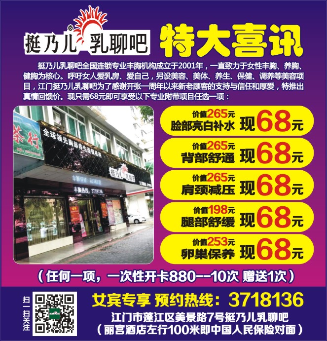 挺乃儿乳聊吧全国连锁专业丰胸机构成立于2001年,一直致力于女性丰胸、养胸、健胸为核心。呼吁女人爱乳房、爱自己,另设美容、美体、养生、保健、调养等美容项目,江门挺乃儿乳聊吧为了感谢开张一周年以来新老顾客的支持与信任和厚爱,特推出真情回馈价。现只需68元即可享受以下专业附带项目任选一项: