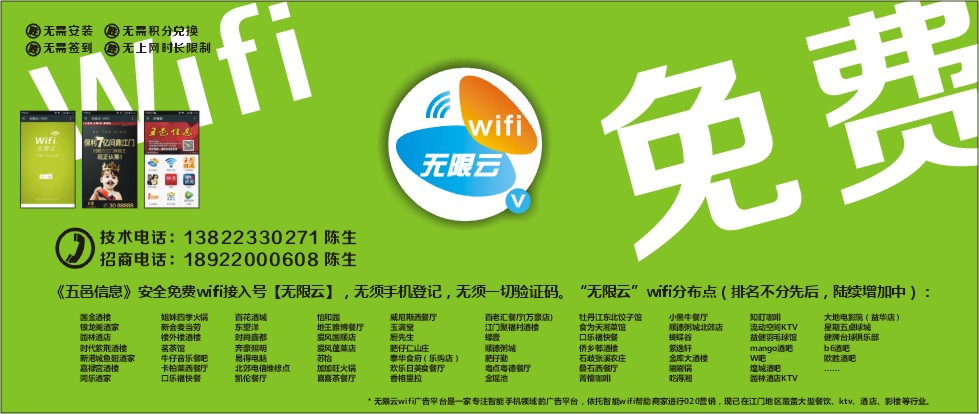 《五邑信息》安全免费wifi接入号【无限云】,无须手机登记,无须一切验证码。“无限云”wifi分布点(排名不分先后,陆续增加中):