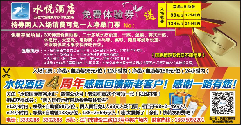 关注“水悦国际商务水汇”微信公众号!转发积赞20个可领一张!以此内推!