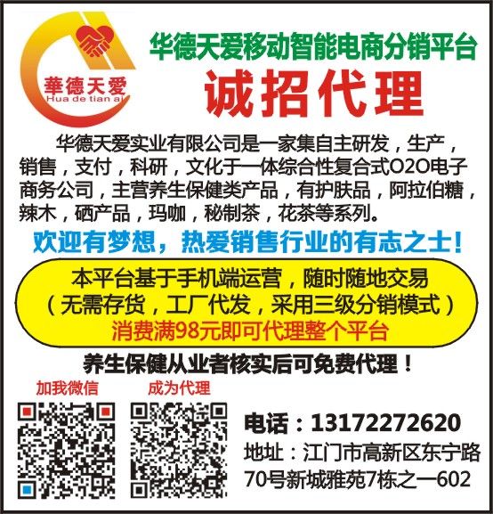 华德天爱实业有限公司是一家集自主研发,生产,销售,支付,科研,文化于一体综合性复合式O2O电子商务公司,主营养生保健类产品,有护肤品,阿拉伯糖,辣木,硒产品,玛咖,秘制茶,花茶等系列。
