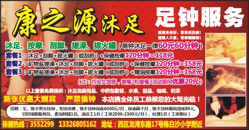沐足、按摩、刮脚、搓澡、拔火罐(单钟沐足一律60元60分钟)