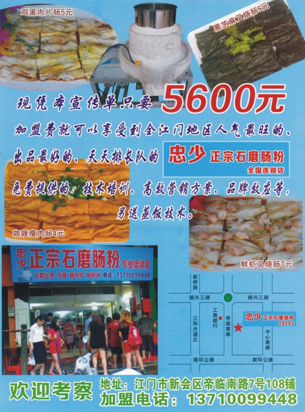 人生梦想从加盟忠少正宗石磨肠粉全国连锁店开始 现凭本广告只要5600元加盟费就可以享受到全江门地区人气超旺的、出品超好的、天天排长队的忠少正宗石磨肠粉全国连锁店 免费提供的:技术培训、高效营销方案、品牌效应等,另送蒸饭技术。 总收入: 早上肠粉:堂食160份、打包80份 240份X平均每份4.5元=1080元/天 1080元/天X30天/月=32400元/月X65%毛利=利润21060元/月 中午蒸饭:50份X10元/份 =500元/天X30天/月=15000元X50%毛利=利润7500元/月 总支出:自己收钱(共:7150元/月) 人工:2800元/月、租金:2800元/月 人工:1050元/月、水电:500元/月 总利润: 21060元/月+7500元/月=28560元/月-总支出7150元/月 =纯利润21410元/月X12月/年=年收入256920元/年 欢迎考察 地址:江门市新会区帝临南路7号108铺 加盟电话:13710099448