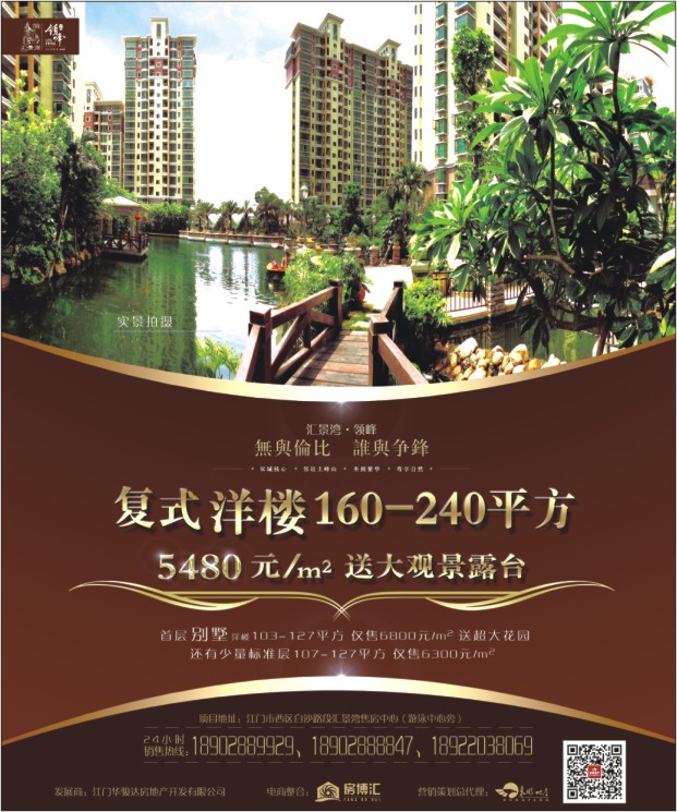 项目地址:江门市西区白沙路段汇景湾售房中心(游泳中心旁)