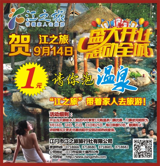 开业当天顾客本人到店内可享受1元购温泉门票优惠,门票使用期限为9月16日、18日、21日、23日和25日,每日限额50名,额满即止。