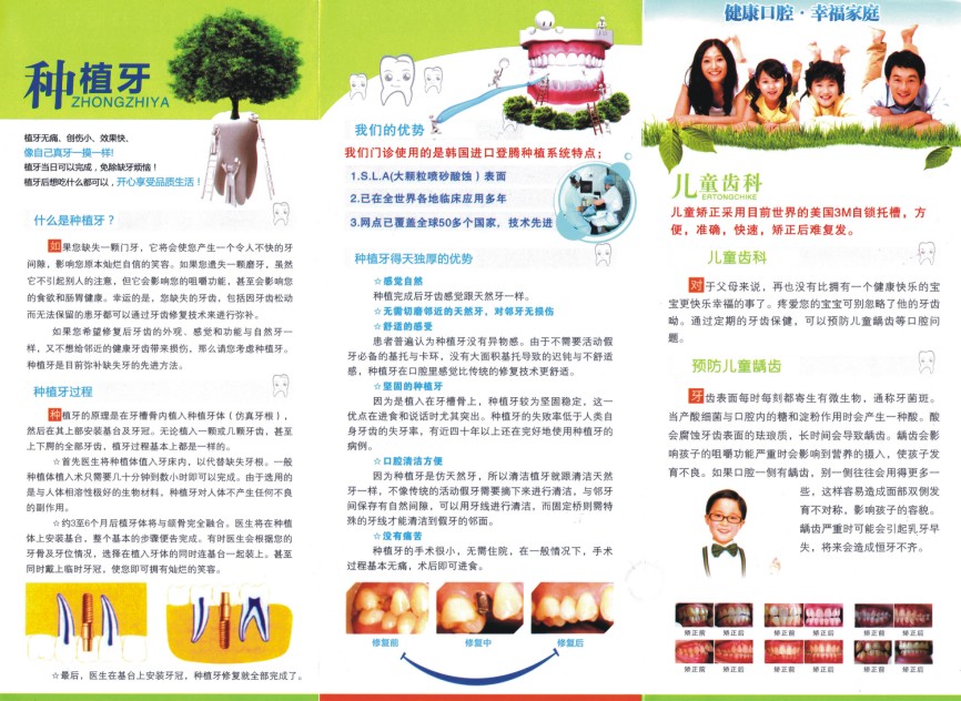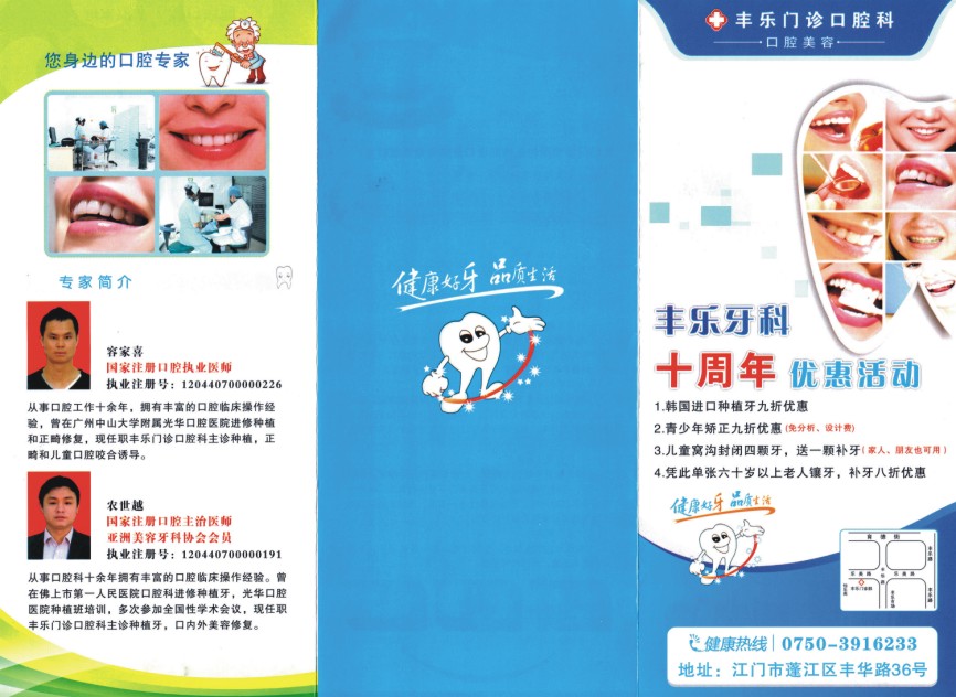 丰乐牙科 十周年优惠活动 1、韩国进口种植牙九折优惠 2、青少年矫正九折优惠(免分析、设计费) 3、儿童窝沟封闭四颗牙,送一颗补牙(家人、朋友也可用) 4、凭此单张六十岁以上老人镶牙,补牙八折优惠 健康热线:0750-3916233 地址:江门市蓬江区丰华路36号