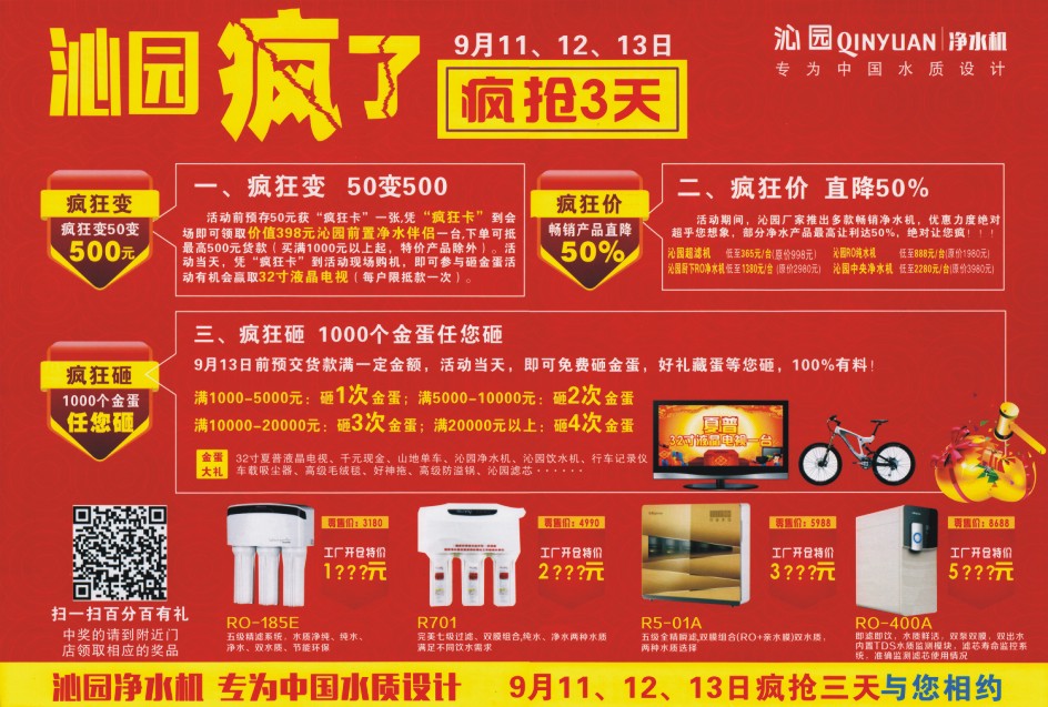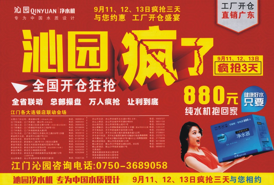 专为中国水质设计 9月11、12、13日疯抢三天 与您约惠 工厂开仓盛宴 沁园疯了 9月11、12、13日 疯抢3天 全国开仓狂抢 全省联动 总部操盘 万人疯抢 让利到底 江门各大连锁店联动会场 沁园江门分公司:建设路42号(旧车站内二楼)电话:3689058 江门车站店:江门市建设一路42号(旧车站内)电话:3689283 江门院士店:江门市蓬江区院士路103号(天河小苑公交店旁)电话:3689033 江门荷塘店:江门荷塘镇市场民兴三街8号103 电话:8238899 江门外海店:江门外海镇朗溪大路3号 电话:3797113 江门礼乐店:江门市江海区礼乐镇礼乐三路206号129室 电话:3630012 新会侨兴北店:新会侨兴北路27号103 电话:6120768 新会悦洋店:新会悦洋街18号111号 电话:6128768 新会信合店:新会振兴三路2号105-2信合大厦侧 电话:6121418 新会司前店:新会区司前镇华悦城市花园3号107铺 电话:6560088 新会睦州店:新会区睦州长安街66号(派出所前行100米)电话:6220268 新会沙堆店:新会区沙堆镇税所对面 电话:6262033 新会古井店:新会区古井镇新建路百业华庭4幢112号(工商所对面) 台山侨雅店:台山市台城侨雅花苑侨仕阁5号 电话:5583136 台山环北店:台山市台城环北大道91号5-6卡 电话:5583727 台山上郎店:台山市台城环市东路69号8卡 电话:5651155 台山端芬店:台山市端芬镇山底圩1号 电话:5355336 台山都斛店:台山市都斛镇建设街第七卡铺(原水利会办公楼)电话:5280339 开平南岛店:开平市新城路中富花园105号 电话:2322602 开平水口店:开平水口镇大福东路海逸华庭122号 电话:2728501 开平步行街店:开平长沙幕涌东路5号102铺步行街名典咖啡侧 电话:2223273 开平曙光店:开平长沙曙光东路187号1幢101之1号鲫鱼粥侧 电话:2170898 鹤山前进南店:鹤山市前进南路123号 电话:8416699 鹤山新业店:鹤山市沙坪新业路848号、850号 电话:8898910 鹤山新湖店:鹤山沙坪镇新湖路57号 电话:8898910 五邑地区: 国美电器连锁系统沁园专柜 恒发电器连锁系统沁园专柜 大泣电器连锁系统沁园专柜 江门沁园咨询电话:0750-3689058 疯狂变 疯狂变50变 500元 一、疯狂变 50变500 活动前预存50元获“疯狂卡”一张,凭“疯狂卡”到会场即可领取价值398元沁园前置净水伴侣一台,下单可抵最高500元货款(买满1000元以上起,特价产品除外)。活动当天,凭“疯狂卡”到活动现场购机,即可参与砸金蛋活动有机会赢取32寸液晶电视(每户限抵款一次)。 疯狂价 畅销产品直降 50% 二、疯狂价 直降50% 活动期间,沁园厂家推出多款畅销净水机,优惠力度绝对超乎您想象,部分净水产品最高让利达50%,绝对让您疯!!! 沁园超滤机低至365元/台(原价998元) 沁园RO纯水机低至888元/台(原价1980元) 沁园厨下RO净水机低至1380元/台(原价2980元) 沁园中央净水机低至2280元/台(原价3980元) 疯狂砸 1000个金蛋 任您砸、 三、疯狂砸 1000个金蛋任您砸 9月13日前预交货款满一定金额,活动当天,即可免费砸金蛋,好礼藏蛋等您砸,100%有料! 满1000-5000元:砸1次金蛋;满5000-10000元:砸2次金蛋 满10000-20000元:砸3次金蛋;满20000元以上:砸4次金蛋 金蛋大礼 32寸夏普液晶电视、千元现金、山地单车、沁园净水机、沁园饮水机、行车记录仪、车载吸尘器、高级毛绒毯、好神拖、高级防溢锅、沁园滤芯……