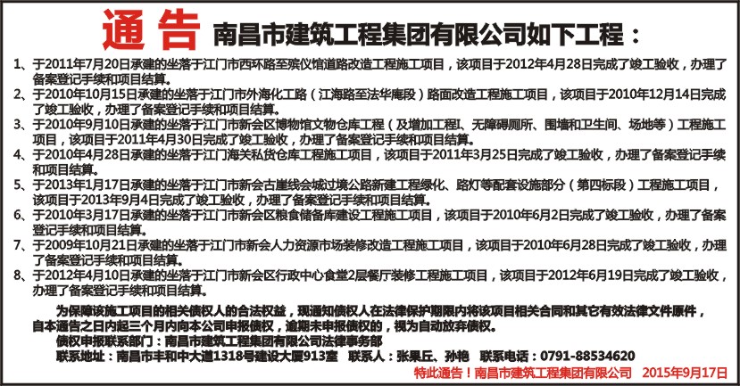 特此通告!南昌市建筑工程集团有限公司 2015年9月17日