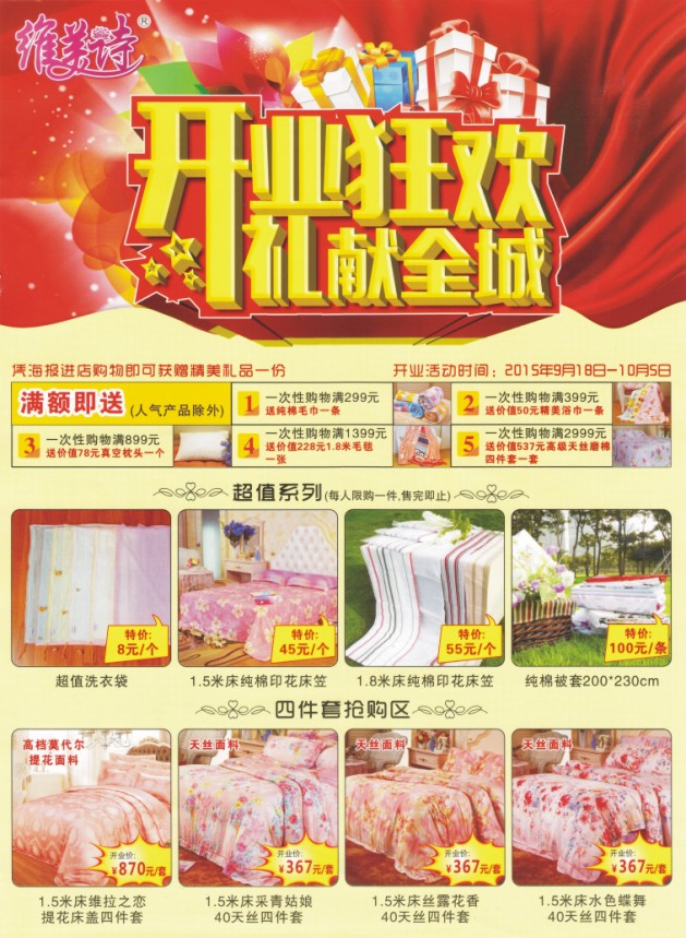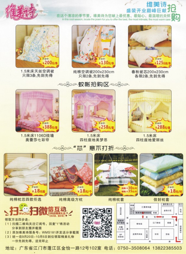 开业狂欢 礼献全城 凭海报进店购物即可获赠精美礼品一份 开业活动时间:215年9月18日-10月5日 满额即送(人气产品除外) 1、一次性购物满299元送纯棉毛巾一条 2、一次性购物满399元送价值50元精美浴巾一条 3、一次性购物满899元送价值78元真空枕头一个 4、一次性购物满1399元送价值228元1.8米毛毯一张 5、一次性购物满2999元送价值537元高级天丝磨棉四件套一套 超值洗衣袋特价:8元/个 1.5米床纯棉印花床笠特价:45元/个 1.8米床纯棉印花床笠特价:55元/个 纯棉被套220*230cm特价:100元/条 1.5米床维拉之恋提花床盖四件套开业价:870元/套 1.5米床采青姑娘40天丝四件套开业价:367元/套 1.5米床丝露花香40天丝四件套开业价:367元/套 1.5米床水色蝶40天丝四件套开业价:367元/套 1.5米床天丝空调被只限3条,先到先得开业价:200元/条 纯棉空调被200x230cm只限2条,先到先得开业价:130元/条 春秋被芯200x230cm各限2条,先到先得开业价:125元起/条 1.5米床1106D挂墙奥蕾莎七彩帘开业价:388元/套 1.5米床四柱座地美梦思开业价:258元/套 1.5米床四柱座地爱丽丝开业价:288元/套 纯棉枕芯四款任选开业价:18元起 纯棉高级方枕开业价:18元/个 纯棉枕套 纯棉:30元/对 裥棉:35元/对 信封枕套开业价:18元/对 扫一扫微信互动 扫码送精美礼品 (洗衣袋、雨伞等) 领取方法四步走: (1)扫描二维码关注订阅号,回复“1”将活动分享到朋友圈并截图 (2)添加维美诗服务号:WMS181并发送分享截图 (3)统一在9月20日-10月5日到位领取精美礼物一份先到先得,送完即止 地址:广东省江门市蓬江区金怡一路12号102室 电话:0750-3508064 13822385503