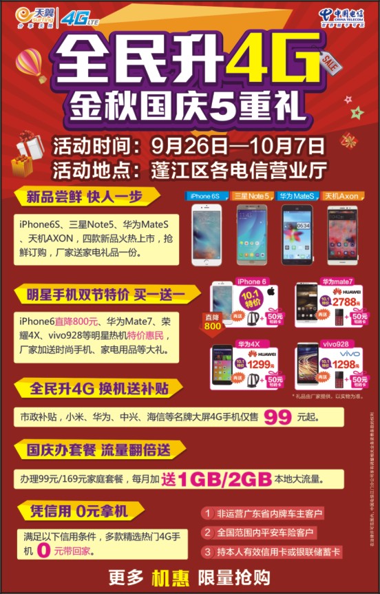 满足以下信用条件,多款精选热门4G手机0元带回家。
