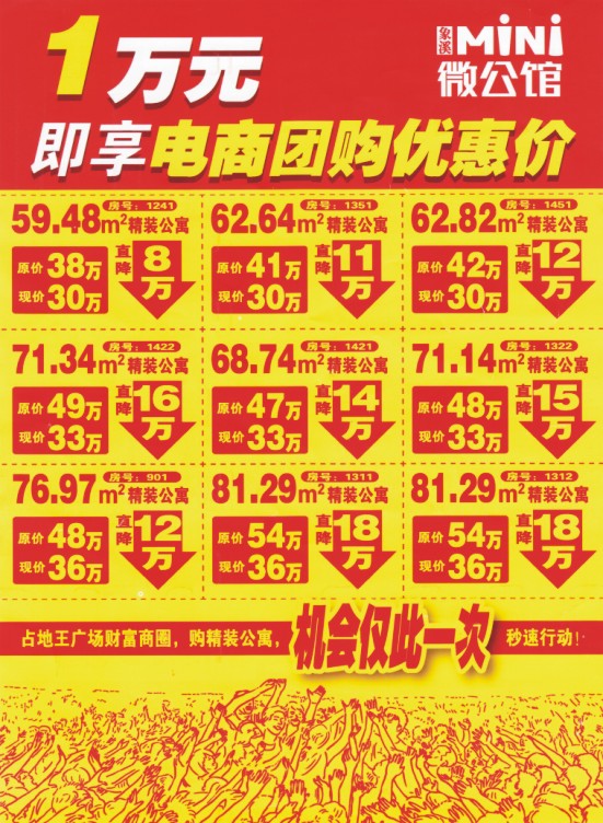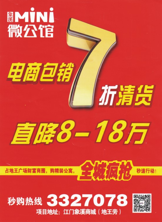 电商包销7折清货 直降8-18万 占地王广场财富商圈,购精装公寓,全城疯抢秒速行动! 1万元即享电商团购优惠价 占地王广场财富商圈,购精装公寓,机公仅此一次秒速行动! 秒购热线:3327078 项目地址:江门象溪商城(地王旁)
