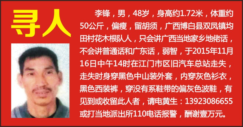 李锋,男,48岁,身高约1.72米,体重约50公斤,偏瘦,留胡须,广西博白县双凤镇均田村花木根队人,只会讲广西当地家乡地佬话,不会讲普通话和广东话,弱智,于2015年11月16日中午14时在江门市区旧汽车总站走失,走失时身穿黑色中山装外套,内穿灰色衫衣,黑色西装裤,穿没有系鞋带的偏灰色波鞋,有见到或收留此人者,请电黄生:13923086655或打当地派出所110电话报警,酬谢壹万元。