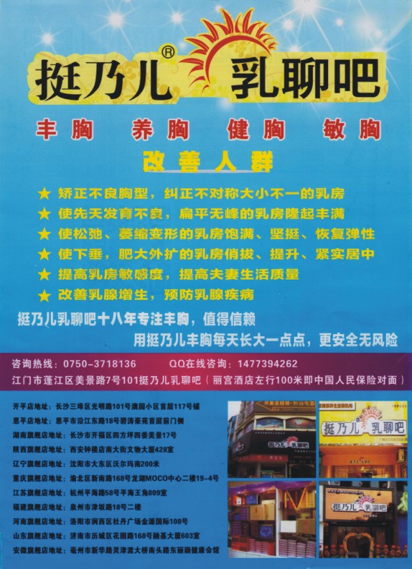 【挺乃儿乳聊吧】全球领先胸部养生连锁机构,成痒痒于2001年,全国七千多家连锁店面,一直致力于女性丰胸、养胸、健胸、美胸为核心,其以不打针、不吃药、不手术、不反弹、安全的丰胸效果得以万众女性的喜爱和信任。丰胸选择安全才是最关键。挺乃儿乳聊吧倡导女人爱乳房,爱自己。从平时就要做好乳房保养、日常护理和疾病预防让您在拥有美丽的同时,更拥有健康的生命。在这里我们将竭力为您服务!!!