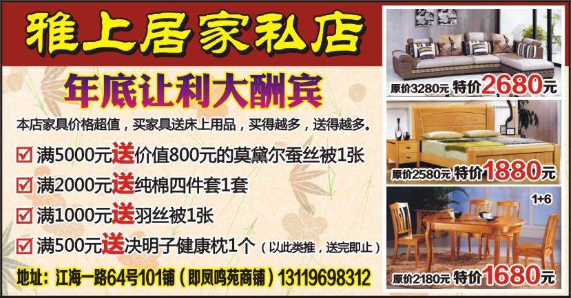 本店家具价格超值,买家具送床上用品,买得越多,送得越多。