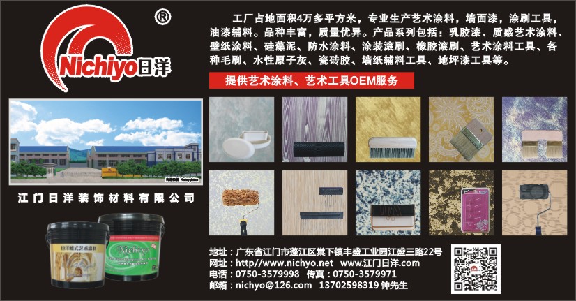 工厂占地面积4万多平方米,专业生产艺术涂料,墙面漆,涂刷工具,油漆辅料。品种丰富,质量优异。产品系列包括:乳胶漆、质感艺术涂料、壁纸涂料、硅藻泥、防水涂料、涂装滚刷、橡胶滚刷、艺术涂料工具、各种毛刷、水性原子灰、瓷砖胶、墙纸辅料工具、地坪漆工具等。