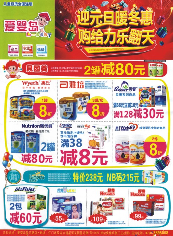 活动地点:爱婴岛星河路店 地址:江门市双龙大道星河花园星河路1号106卡 妇幼保健院侧门正对面 送货电话:0750-3695008
