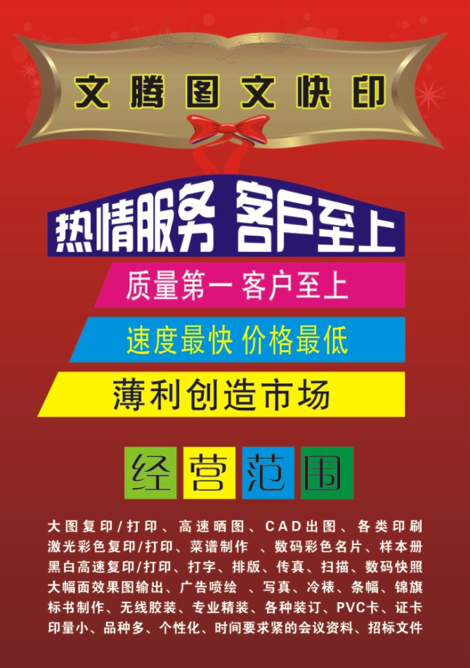 大图复印/打印、高速晒图、CAD出图、各类印刷激光彩色复印/打印、莱谱制作、数码彩色名片、样本册黑白高速复印/打印、打字、排版、传真、扫描、数码快照大幅面效果图输出、广告喷绘、写真、冷裱、条幅、锦旗标书制作、无线胶装、专业精装、各种装订、PVC卡、证卡印量小、品种多、个 性化、时间要求紧的会议资料、招标文件