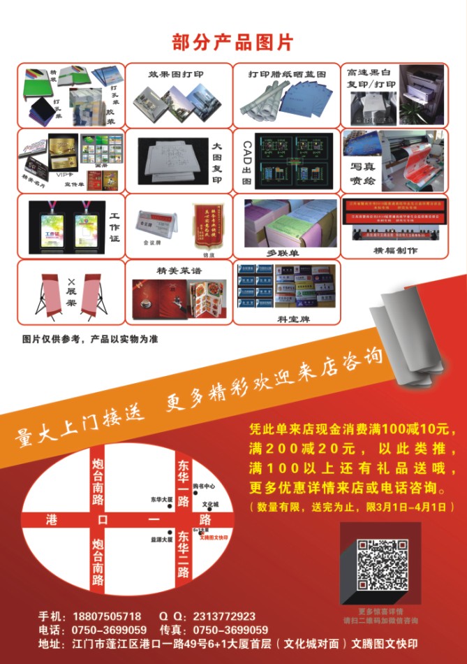 地址:江门市蓬江区港口一路49号6+1大厦首层(文化城对面)文腾图文快印