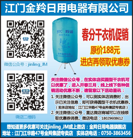 1. 关注微信公众号,可以到实体店消费时,出示已关注信息,即可获得圆型干衣机优惠券。(实体店地址:江门江华路47号金羚集团专卖店)