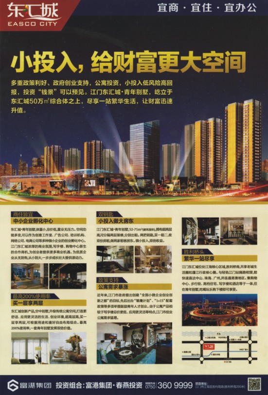多重政策利好、政府创业支持,公寓投资,小投入低风险高回报,投资“钱景”可以预见。江门东汇城·青年别墅,屹立于东汇城50万m2综合体之上,尽享一站繁华生活,让财富迅速升值。