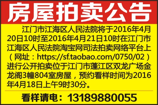 江门市江海区人民法院将于2016年4月20日10时至2016年4月21日10时在江门市江海区人民法院淘宝网司法拍卖网络平台上(网址: