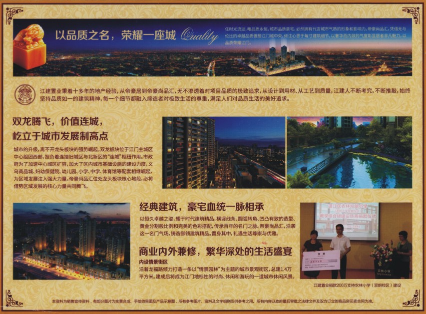 江建置业秉着十多年的地产经验,从帝豪居到帝豪尚品汇,无不渗透着对项目品质的极致追求,从设计到用材、从工艺到质量,江建人不断考究,不断推敲,始终坚持品质如一的建筑精神,每一个细节都融入缔造者对极致生活的尊重,满足人们对品质生活的美好追求。