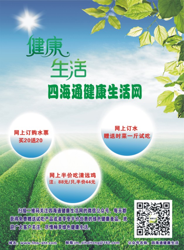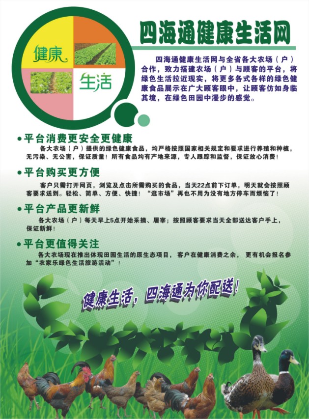 四海通健康生活网与全省各大农场(户)合作,致力搭建农场(户)与顾客的平台,将绿色生活拉近现实,将更多各式各样的绿色健康食品展示在广大顾客眼中,让顾客仿如身临其境,在绿色田园中漫步的感觉。