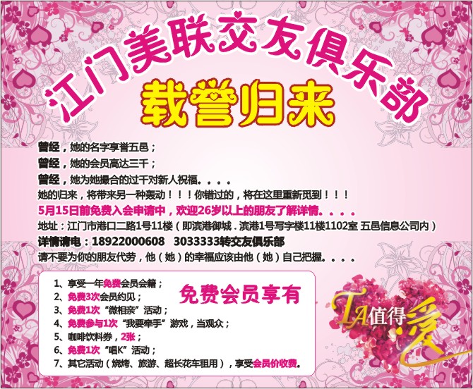 5月15日前免费入会申请中,欢迎26岁以上的朋友了解详情。。。。