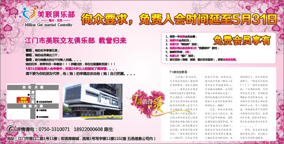 多么渴望另一半的到来。原以为大部份朋友咨询美联俱乐部免费入会有什么什么的优惠,但原来只有哪么两三个朋友这样问;