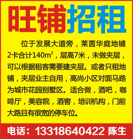 位于发展大道旁,莱茵华庭地铺2卡合计140m2,层高7米,未做夹层,可以根据租客需要建夹层。或者只租地铺,夹层业主自用,高尚小区对面马路为城市花园别墅区。适合做,酒吧,咖啡厅,美容院,酒窖,培训机构,门前大路且有很宽的停车位。