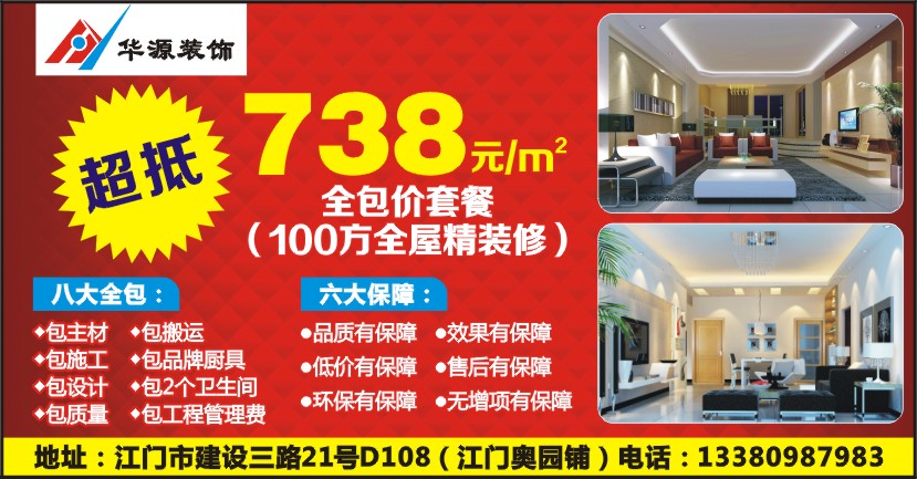 超抵 738元/m2 全包价套餐 (100方全屋精装修) 八大全包: ◆包主材 ◆包施工 ◆包设计 ◆包质量 ◆包搬运 ◆包品牌厨具 ◆包2个卫生间 ◆包工程管理费 六大保障: ●品质有保障 ●低价有保障 ●环保有保障 ●效果有保障 ●售后有保障 ●无增项有保障 地址:江门市建设三路21号D108(江门奥园铺)电话:13380987983