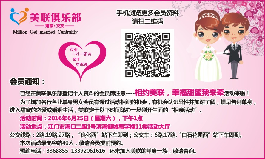 预约电话:3368855 13392061616 还未加入美联的单身一族,敬请咨询。