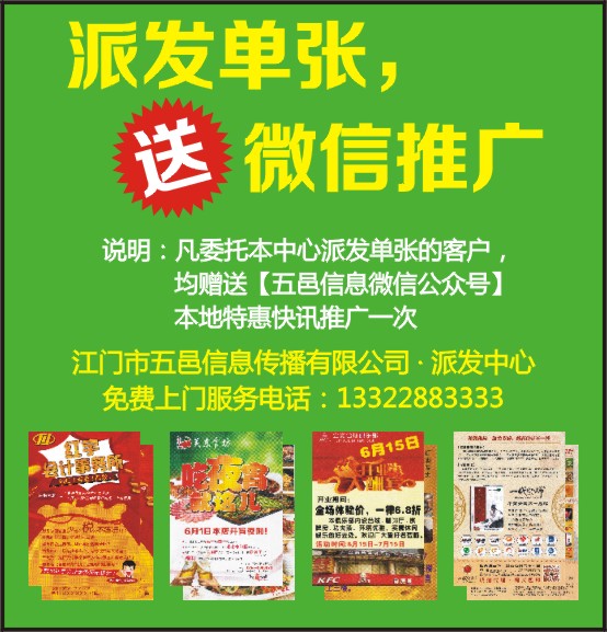 说明:凡委托本中心派发单张的客户,均赠送【五邑信息微信公众号】本地特惠快讯推广一次