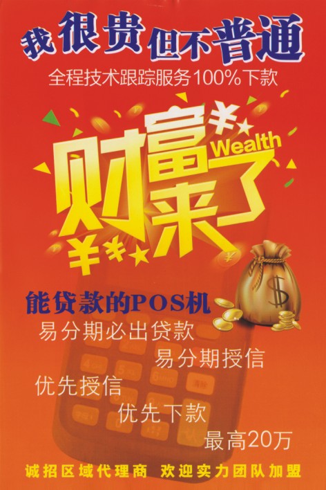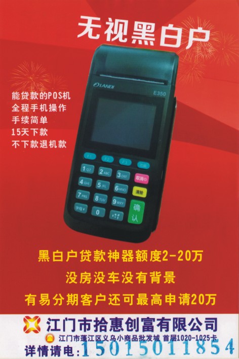 我很贵但不普通 全程技术跟踪服务100%下款 财富来了 能贷款的POS机 易分期必出贷款 易分期授信 优先授信 优先下款 最高20万 诚招区域代理商 欢迎实力团队加盟 无视黑白户 能贷款的POS机 全程手机操作 手续简单 15天下款 不下款退机款 黑白户贷款神器额度2-20万 没房没车没有背景 有易分期客户还可最高申请20万 江门市拾惠创富有限公司 江门市蓬江区义乌小商品批发城首层1020-1025卡 详情请电:15015011854