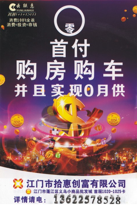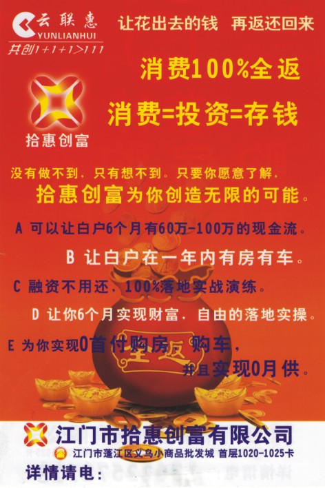 零首付购房购车并且实现0月供 让花出去的钱 再返还回来 消费100%全返 消费=投资=存钱 没有做不到,只有想不到。只要你愿意了解,拾惠创富为你创造无限的可能。 A可以让白户6个月有60万-100万的现金流。 B让白户在一年内有房有车。 C融资不用还,100%落地实战演练。 D让你6个月实现财富,自由的落地实操。 E为你实现0首付购房、购车,并且实现0月供。 江门市拾惠创富有限公司 江门市蓬江区义乌小商品批发城首层1020-1025卡 详情请电:13622578528