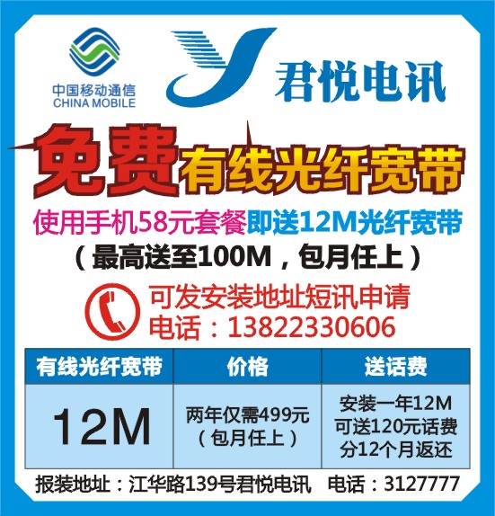 报装地址:江华路139号君悦电讯 电话:3127777