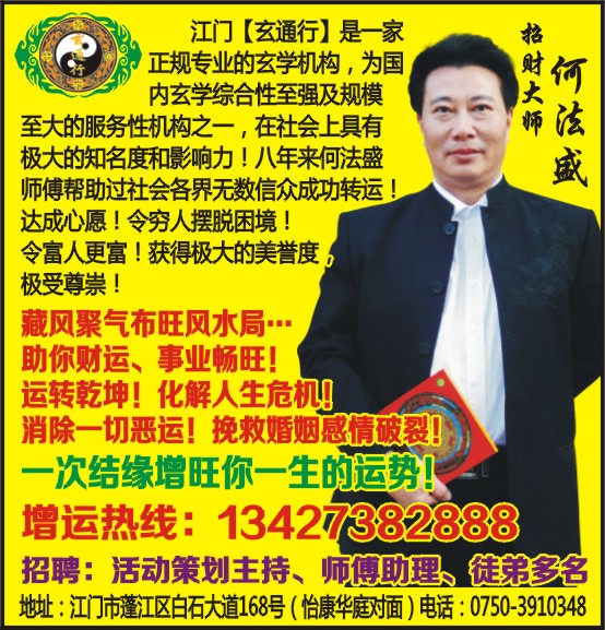 江门【玄通行】是一家正规专业的玄学机构,为国内玄学综合性至强及规模至大的服务性机构之一,在社会上具有极大的知名度和影响力!八年来何法盛师傅帮助过社会各界无数信众成功转运!达成心愿!令穷人摆脱困境!令富人更富!获得极大的美誉度,极受尊崇!