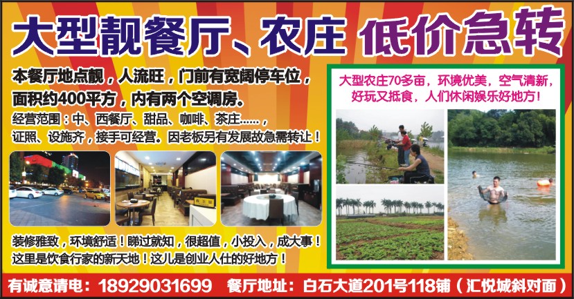 本餐厅地点靓,人流旺,门前有宽阔停车位,面积约400平方,内有两个空调房。 经营范围:中、西餐厅、甜品、咖啡、茶庄……,证照、设施齐,接手可经营。因老板另有发展故急需转让! 装修雅致,环境舒适!睇过就知,很超值,小投入,成大事! 这里是饮食行家的新天地!这儿是创业人仕的好地方! 大型农庄70多亩,环境优美,空气清新,好玩又抵食,人们休闲娱乐好地方! 有诚意请电:18929031699 餐厅地址:白石大道201号118铺(汇悦城斜对面)