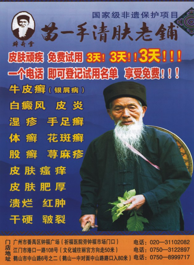国家级非遗保护项目 皮肤顽疾 免费试用 3天!3天!!3天!!! 一个电话 即可登记试用名单 享受免费!!! 牛皮癣(银屑病) 白癜风 皮炎 湿疹 手足癣 体癣 花斑癣 股癣 荨麻疹 皮肤瘙痒 皮肤肥厚 溃烂 红肿 干硬 皲裂 门店地址 广州市番禺区钟福广场(祈福医院旁钟福市场门口)电话:020-31102082 江门市港口一路108号(文化城往丽宫方向走50米)电话:0750-3122897 鹤山市中山路6号之二(鹤山一中对面中山路路口入80米)电话:0750-8999717