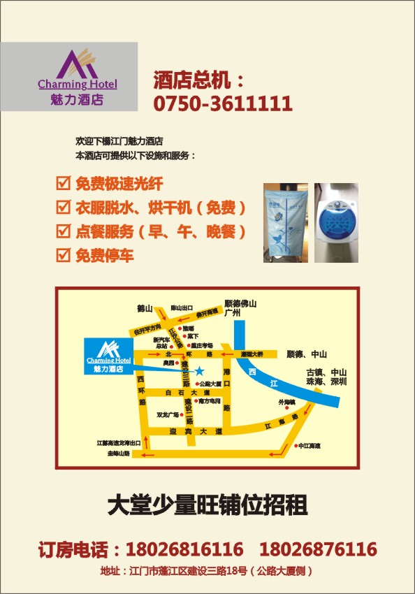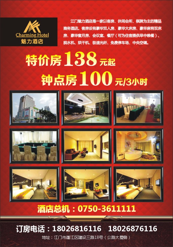 江门魅力酒店是一家以客房、休闲会所、棋牌为主的精品商务酒店。客房设有豪华双人房、豪华大床房、豪华麻将双床房、豪华蜜月房、会议室、餐厅(可为住客提供早中晚餐)、脱水机、烘干机、极速光纤、免费停车场、中央空调。 特价房138元起 钟点房100元/3小时 欢迎下榻江门魅力酒店 本酒店可提供以下设施和服务: 免费极速光纤 衣服脱水、烘干机(免费) 点餐服务(早、午、晚餐) 免费停车 大堂少量旺铺位招租 酒店总机:0750-3611111 订房电话:18026816116 18026876116 地址:江门市蓬江区建设三路18号(公路大厦侧)