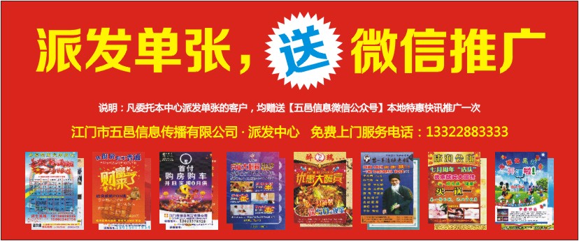 说明:凡委托本中心派发单张的客户,均赠送【五邑信息微信公众号】本地特惠快讯推广一次
